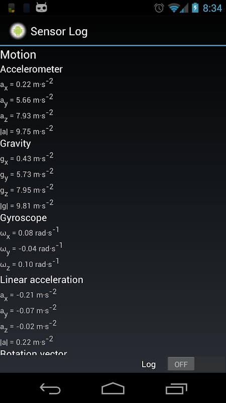 Logs data from available sensors (with timestamps) in CSV files on external storage.