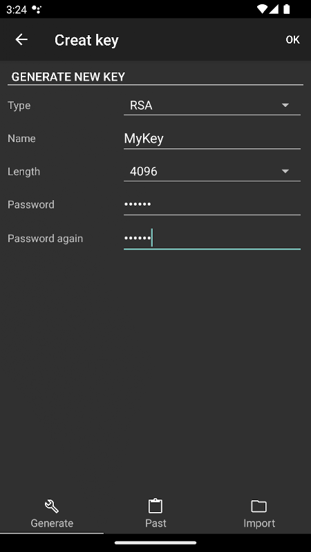 &lembu jantan; Alat untuk bekerja dengan kunci SSH membolehkan anda menjananya, serta mengimport dan mengeksportnya. Kekunci RSA, DSA, EC, ED25519 disokong dan format openssh-key-v1 digunakan untuk menyimpannya.