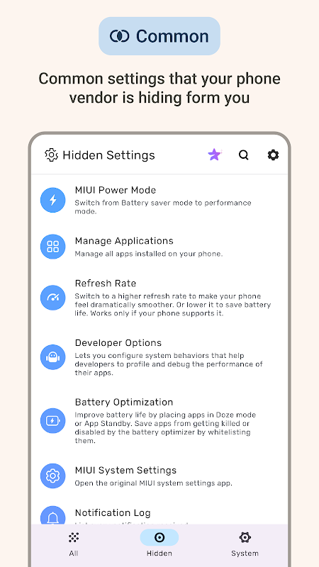 Stop digging through confusing settings app menus. Hidden Settings is the quick, powerful, all-in-one settings app and Activity Launcher for settings app that puts you back in control of your phone's settings. We offer quick access to every phone setting, app setting, and system setting, making device settings easy to find and manage.