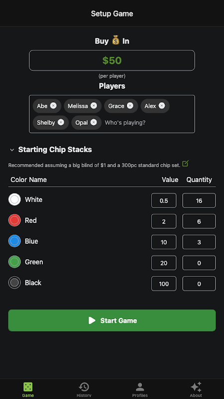 Tiada lagi meneka permulaan pengedaran cip atau janggal "Hmmm, 3 biru, 20 merah, 15 hijau - itu akan menghasilkan $50 bukan?" detik-detik. Hanya masukkan jumlah belian anda, kiraan pemain, saiz buta pilihan, dan SettleChip serta-merta mengira pecahan cip yang kukuh menggunakan piawaian industri poker. Dapatkan bermain pantas dengan timbunan boleh dimainkan yang adil.