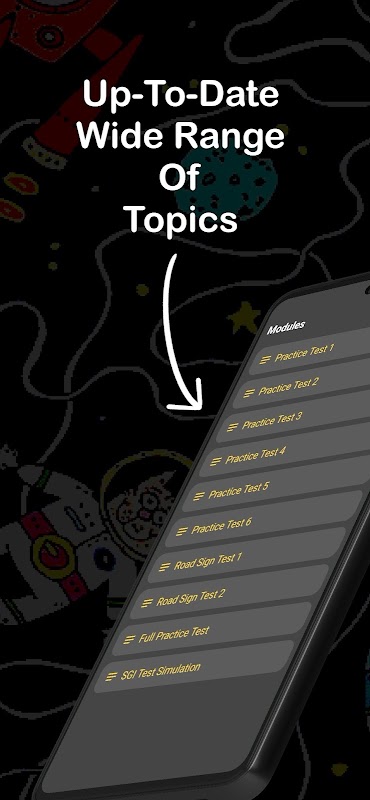 📚 Pelbagai Modul Soalan: Berlatih dengan modul berbeza yang merangkumi papan tanda jalan, peraturan dan peraturan, dan banyak lagi.