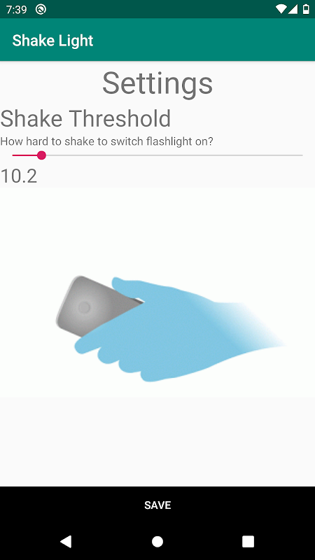 Ini adalah aplikasi yang sangat mudah, cukup klik butang untuk menyalakan lampu suluh telefon anda dan juga dengan mengguncang telefon anda jika anda berfikir bahawa goncangannya sangat tajam maka anda dapat membuatnya lebih sukar dari pengaturan.