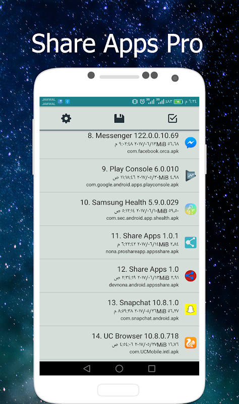 Share Apps show your applications with a list, you can get a installation package directly from your memory and send it to your friends as a attachment.