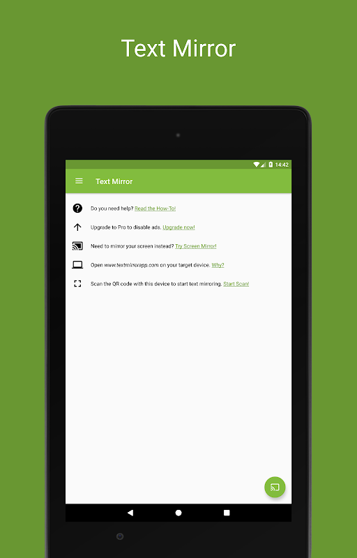 Hanya buka https://www.textmirrorapp.com pada peranti jauh anda, mulakan proses teks mencerminkan pada peranti Android anda, mengimbas kod QR dan mirroring bermula serta-merta. Semudah itu. Tiada perisian tambahan pada peranti sasaran anda diperlukan.