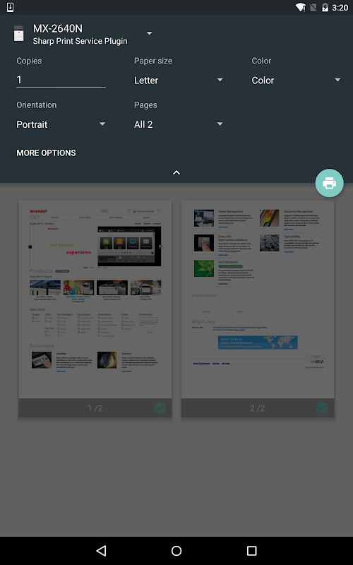 Pemalam Perkhidmatan Cetakan Sharp membolehkan pencetakan dokumen dan imej pada peranti mudah alih Android ke MFP Sharp yang disokong. Untuk mengaktifkan apl ini, buka pilihan cetakan di bawah menu tetapan pada peranti mudah alih Android anda, pilih Sharp Print Service Plugin, dan kemudian hidupkan suis HIDUP.