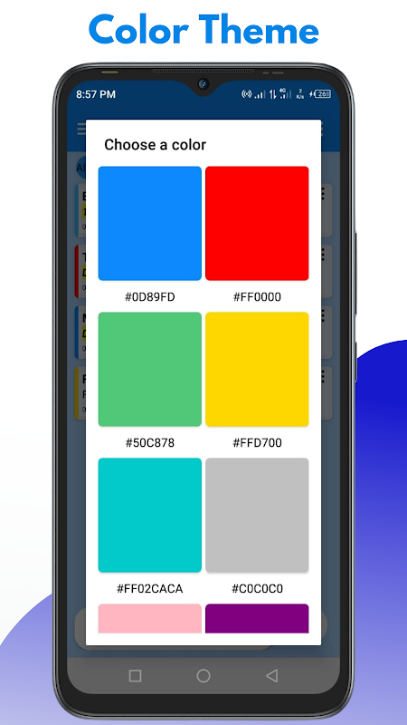 4. Latar Belakang Apl Boleh Disesuaikan: Anda boleh menukar Latar Belakang menggunakan foto tema, tema warna atau foto daripada galeri peranti anda.