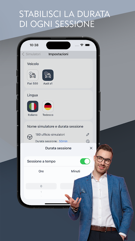 TETAPAN AWAL: membolehkan anda memilih jenis kotak gear, manual atau automatik, untuk mensimulasikan pelajaran; jenis kereta, bahasa antara Itali dan Jerman dan tempoh sesi.