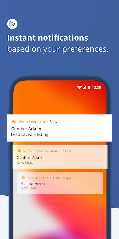 ** Pemberitahuan Segera, Berdasarkan Pilihan Anda. - Suapan pemberitahuan dalam aplikasi anda memaparkan maklumat yang anda mahu tampilkan - termasuk pilihan untuk penugasan prospek baru, bila-bila masa petunjuk menyimpan harta atau meminta lebih banyak maklumat, dan banyak lagi. Urus dengan cepat jenis dan kaedah pemberitahuan anda dari dalam aplikasi.