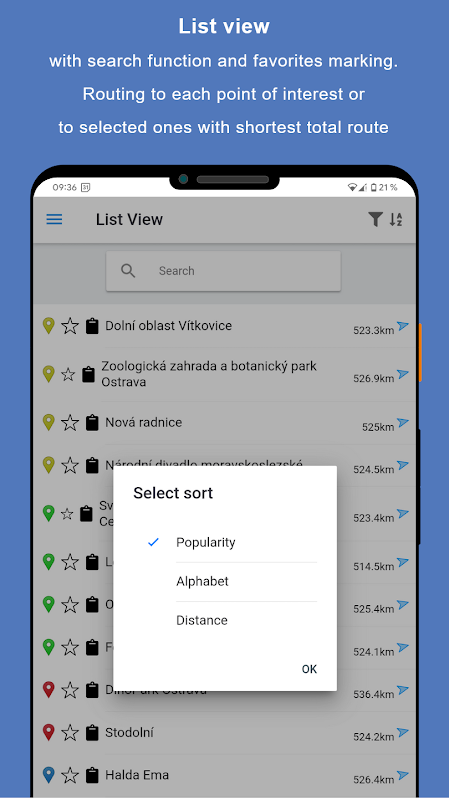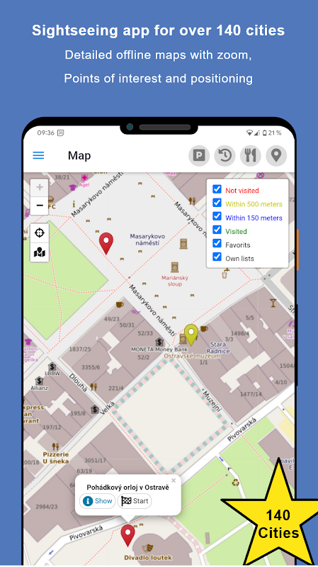 * Paparkan banyak tempat menarik (40 - 200) pada peta Ostrava yang didayakan di luar talian