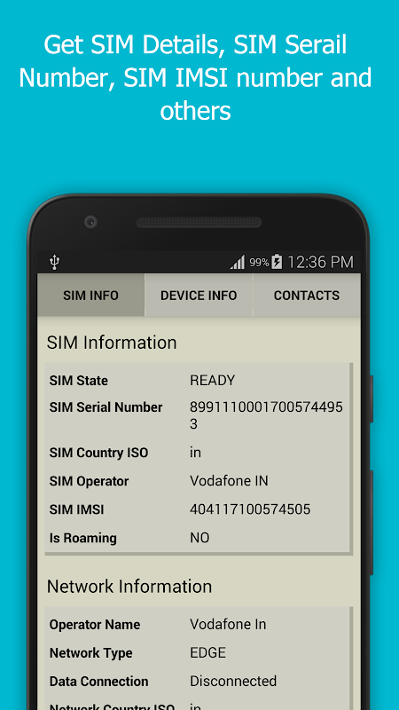 SIM Details : Operator name, SIM Status, SIM IMSI, Roaming Information, Mobile Data Status, Country ISO.