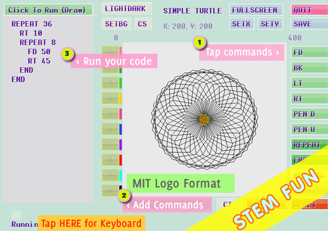 Belajar Mengekod dengan apl pengekodan Simple Turtle STEM, buat kod pengaturcaraan ringkas dengan arahan Logo Kura-kura untuk mengawal Turtle anda dan melukis imej serta reka bentuk yang menyeronokkan.