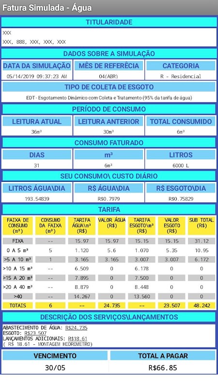 Com o Simulador de Fatura, você poderá simular o valor da sua próxima fatura de água evitando surpresas na sua conta podendo adequar seu orçamento com a previsão antecipada de gastos. Calculamos a fatura indicando o consumo diário, quantidade consumida e valores de água, esgoto e serviços adicionais. No final da operação poderás salvar e compartilhar sua simulação, assim como na fatura real. Faça você mesmo a leitura de consumo de água, escolha entre as diversas categorias de consumo e coleta de esgoto, lance os dados no aplicativo e deixe-o simular a fatura pra você! No final você ainda poderá enviar a fatura simulada pra quem você quiser, ou salvá-la em seu dispositivo. Com uma precisão impressionante, o Simulador de Fatura calcula sua fatura com base na tabela tarifária vigente em Minas Gerais-Brasil (Resolução ARSAE-MG 111, DE 28JUN18 - VIGENTE ATUALMENTE). O aplicativo poderá não fornecer precisão em estados em que a tarifação seja regida por norma diversa à citada acima. O aplicativo fornece precisão às tarifações aplicadas pela companhia de saneamento do estado de Minas Gerais (Copasa) porém não é um aplicativo oficial Copasa. O aplicativo possui todas as categorias de consumo: Residencial Social; Residencial; Comercial; Industrial e Público. Possui também todos os tipos de coleta de esgoto: EDC(com coleta); EDT(com coleta e tratamento). É possível adicionar na fatura lançamentos adicionais que não são provenientes do consumo de água ou esgoto mas que pode estar vindo em sua fatura atualmente, como é o caso de taxas extras diversas, como por exemplo: taxa de montagem de hidrômetro. É só preencher os dados corretamente e sua fatura será emitida com precisão. DÚVIDAS QUANTO AO PREENCHIMENTO DOS DADOS NO APLICATIVO?! _ É só consultar sua fatura do mês anterior e saberá sua categoria de consumo e tipo de coleta de esgoto em sua localidade.