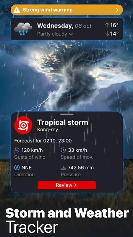 Bersedia untuk cuaca buruk dengan penjejak taufan, yang menyediakan amaran untuk taufan dan ribut tropika. Jika anda berada di kawasan seperti kawasan cuaca UAE, ciri ini memaklumkan anda tentang potensi bahaya. Penjejak salji membantu anda mengikuti ribut musim sejuk, menjadikannya lebih mudah untuk merancang keadaan cuaca sejuk. Bagi mereka yang memantau cuaca tropika, penjejak siklon memastikan anda mempunyai kemas kini ribut terkini di hujung jari anda.