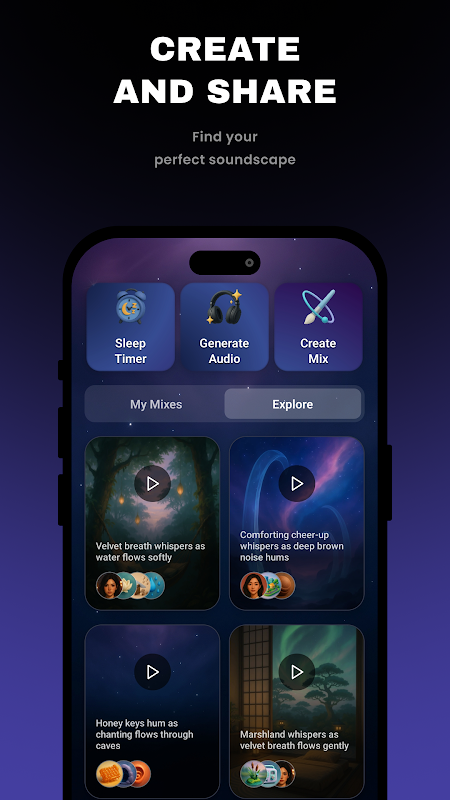 • Skap Bunyi 3D Dijana AI: Selami kelonggaran yang tidak berkesudahan dengan skap bunyi yang dicipta dengan cepat oleh kecerdasan buatan. Nikmati pemandangan audio 3D yang unik dan berkembang setiap kali – gabungan bunyi ambien yang segar dan pencetus ASMR yang disesuaikan untuk memastikan anda santai dan terlibat.