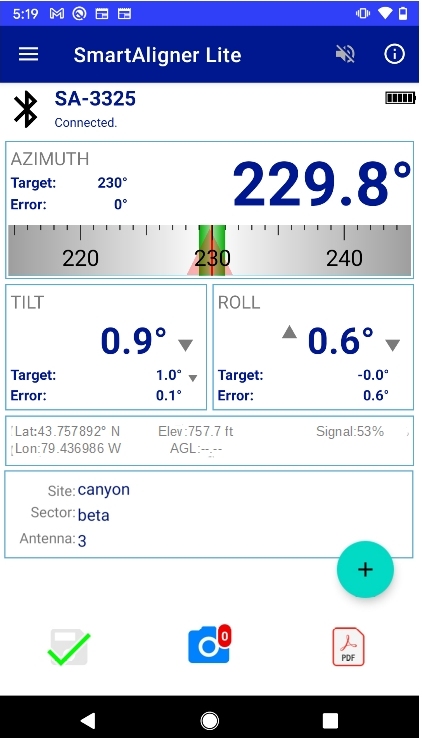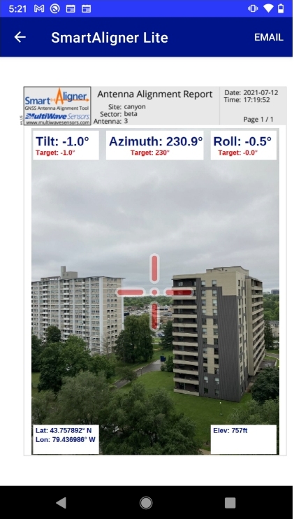Align your antenna to the correct azimuth and tilt in real-time and take a Line of Sight (LOS) image. All alignment information is annotated on the LOS image in a single page PDF report. Additional images can be added. View and share the report with a few clicks.