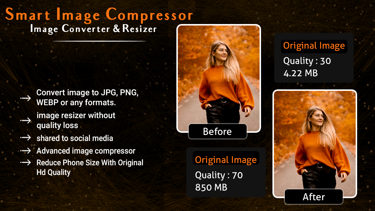 Using this b>Smart Image Compressor : Image Converter & Resizer app make your phone faster and save space in your phone without lse qulity of your images.