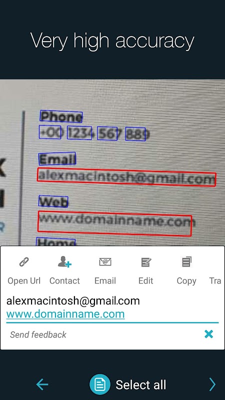 Imbas nombor telefon, pindai URL laman web, pindai kad nama, pindai kenalan, pindai e-mel, dan pindai segala-galanya dalam teks dengan aplikasi Smart Lens.