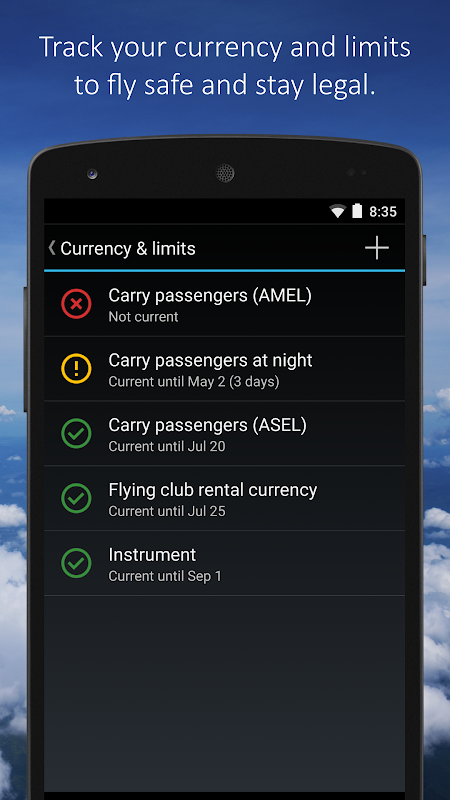 Buku Log Pintar menjadikan pengelogan penerbangan anda pantas dan mudah. Ia disegerakkan secara automatik dalam talian, jadi anda boleh memulihkannya serta-merta jika anda menaik taraf atau kehilangan telefon anda. Apabila anda memohon penarafan baharu atau temu duga untuk sesuatu pekerjaan, anda boleh melihat jumlah penerbangan anda dengan mudah, dalam sebarang jangka masa, dalam sebarang jenis pesawat. Jejaki mata wang dan had anda, dan dapatkan peringatan untuk memperbaharui latihan perubatan dan berulang anda. Apabila pengalaman terbang anda berkembang, gunakan peta interaktif untuk melihat sendiri (dan tunjukkan kepada rakan anda!) semua tempat terbang telah membawa anda.