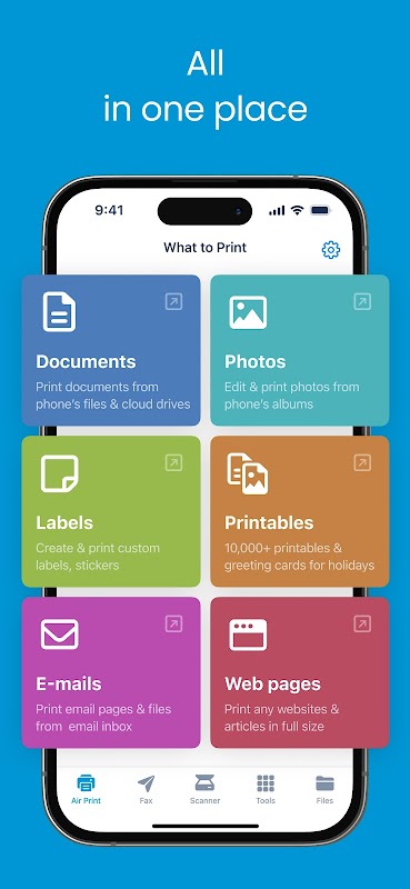 Print photos, files, emails and labels from your mobile. Edit tools for photos & PDF. Transfer files.