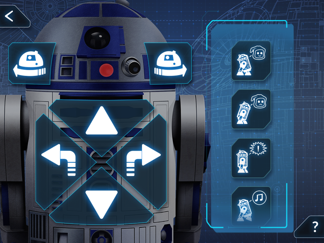 • Lancarkan aplikasi Hasbro Smart R2-D2™ untuk mengawal Smart R2-D2™. Gunakan aplikasi untuk membuat R2-D2 bertindak balas dan bergerak, dan untuk menukar lampu dan kesan bunyi.
