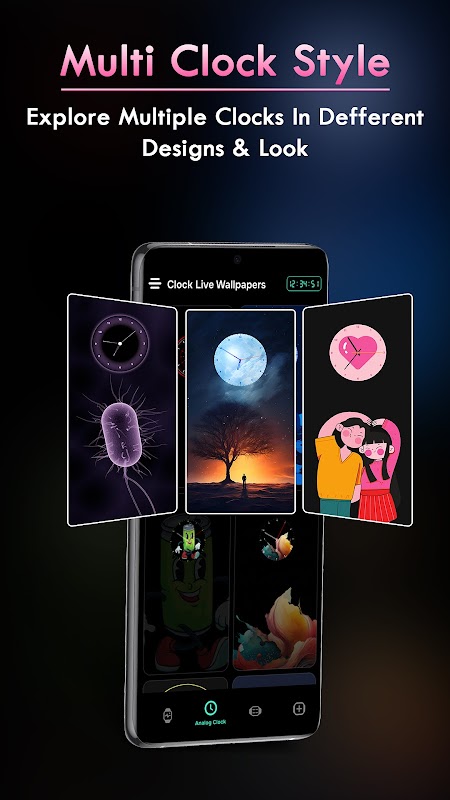 Aplikasi kertas dinding yang bergaya ini sesuai untuk pengguna yang menyukai penyesuaian bertema masa. Sama ada anda menyukai kertas dinding jam digital moden, reka bentuk jam analog klasik atau rupa anggun wajah jam pintar, apl ini mempunyai semuanya. Tambahkan jam masa nyata pada skrin utama anda dengan muka jam animasi cantik yang digabungkan dengan sempurna dengan mana-mana tema kertas dinding.