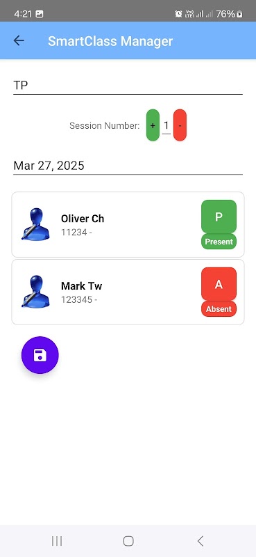 Attendance Tracking: Record and manage attendance for each class session with options for Present, Absent, or Leave.