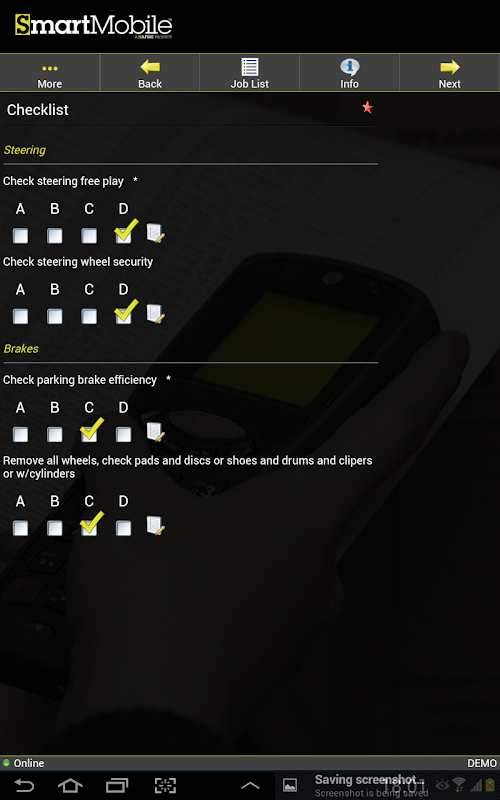 • Accept a job and record its progress using intuitive wizard style screens. The information that will be displayed or requested on each screen will be completely configurable using Smart. Examples of typical information that might be included for each job are: