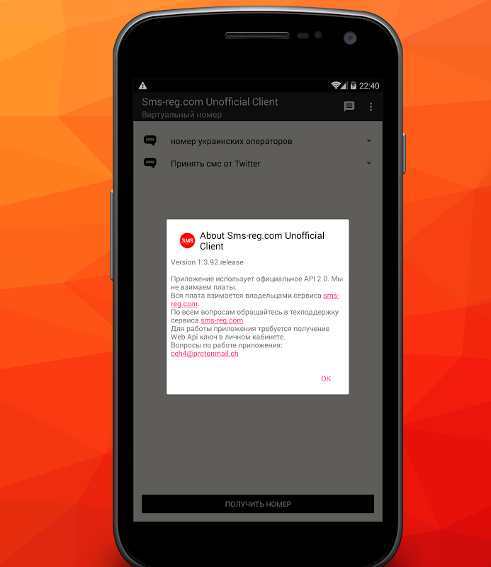 Pelanggan tidak rasmi untuk Android, perkhidmatan sewa nombor maya sms-reg.com.