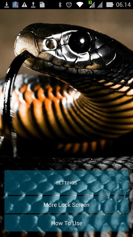 Snakes are animals that many feared by humans, because there are several types of snakes that can grow very large that can prey on humans though, then some types of snakes also have a very dangerous toxins that can kill animals or dozens of humans in one drop poison. Some types of snakes very dangerous because the poison is owned by the snake is, snake King Cobra, Black Mamba, and Viper snake. Snake Live Lock Screen is a screen lock application with the latest design themed snake life wild in the form of wallpaper / background. The snake background we provide is very varied, real and high quality. Lock Screen for Snake Live is very easy to activate, that is by entering 6 digit number as opening password number, which is in setting menu, that is in column "Pass Code". Then select the Snap Wallpaper we provide in the "Change Wallpaper" column.