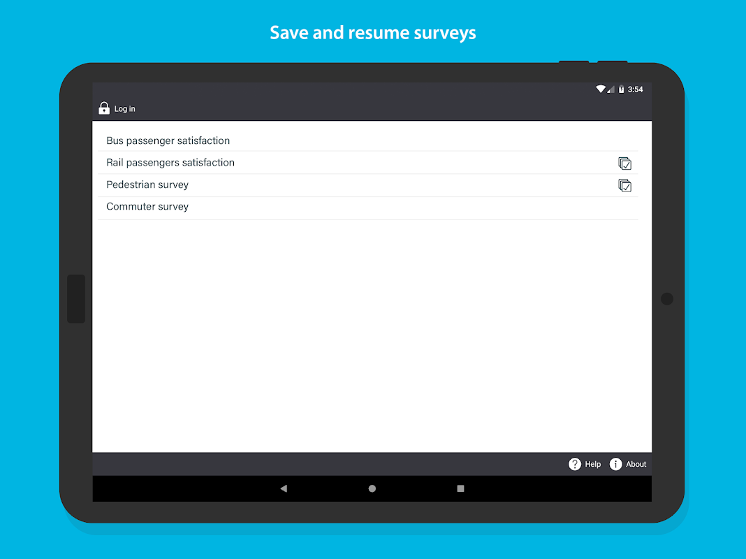 Menyambungkan secara automatik ke pelayan WebHost Snap untuk memuat naik soal selidik yang lengkap dan memuat turun tinjauan terkini. Kemudahan yang luas untuk membantu penemuduga bergerak lancar melalui soal selidik, dengan slaid, perutean, penggantian teks dan penyamaran. Tinjauan boleh merangkumi gambar dan juga soalan berdasarkan teks.