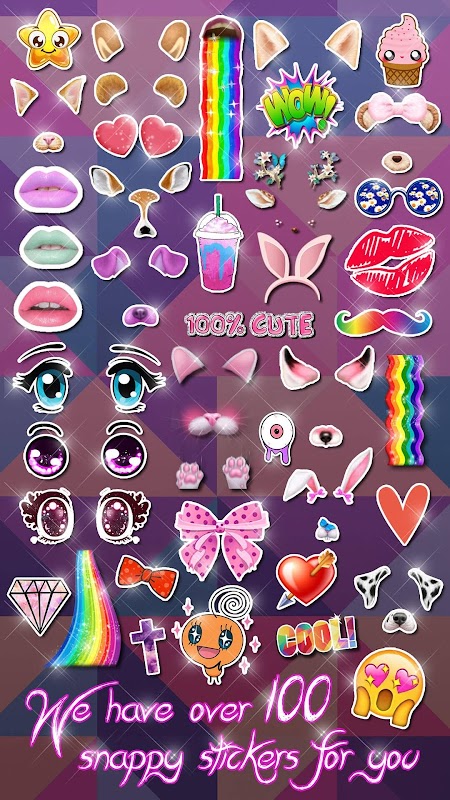 There are many stickers apps which offer many different and interesting “filters for pictures”. This edit photo sticker app is the best as it offers unique and very unusual snappy photo filters stickers 2018. Download this app and you will feel like a pro photographer who can make interesting stickers for pictures with cat ears, eyes, and nose, rabbit face camera, snappy doggy face or with manga eyes. Edit photos like a pro and enjoy your stickers!