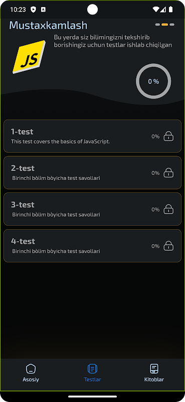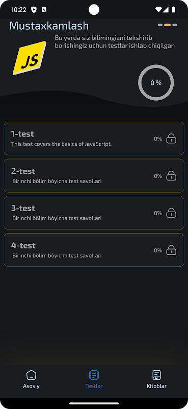 Ilovamiz istalgan foydalanuvchi uchun JavaScriptni o'rganishda yordam beruvchi, oson va qulay darslar o'z ichiga olgan mobil ilova. Bu ilova orqali foydalanuvchilar JavaScriptni asosiy sintaksisini o'rganib, funksiya, o'zgaruvchilar, massivlar, obyektlar, vaqtincha bo'lish va qo'shimcha ko'ntrallar kabi asosiy konseptlarni tushunishadi. Har bir dars interaktiv usulda taqdim etiladi, shuningdek darslarni sinov qismi bor. Ilova ichida o'zgaruvchilar bilan mashg'ul bo'lish, dasturlashda yordam berish va nafaqat yukori saviyadagi kodni yozish, balki uni tahlil qilish va aniqlashga ham duch kelishingiz mumkin. Ilovadan foydalanish orqali, JavaScript bo'yicha malakangizni oshirishingiz va dasturlash sohasida rivojlanishingizga yordam beramiz."