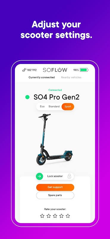 Aplikasi ini menemani anda dan skuter anda melalui kehidupan seharian. Kunci skuter anda secara elektronik, paparkan laluan yang diliputi pada peta, semak tahap cas bateri dan banyak lagi.