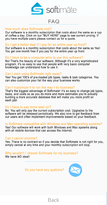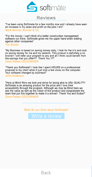 Softimate is a program designed by a contractor with the help of some computer geeks. We took all the nonsense out like you get from other software and concentrated on the nuts and bolts that really make your job easier. Listen, we are all busy and dont have time to spend hours and hours on the stuff nobody wants to do...so no worries we'll take care of it for you!