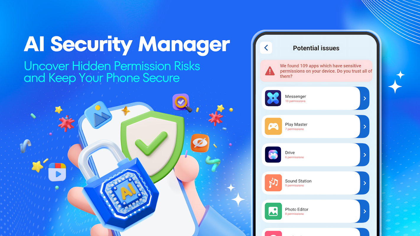 Apl kami menggabungkan pengurus kebenaran apl, kemas kini perisian dan ciri keselamatan mudah alih yang berkuasa untuk melindungi peranti anda daripada ancaman. Dengan kemas kini apl, keselamatan rangkaian dan pengurusan risiko apl, membantu memastikan telefon anda dilindungi daripada pelbagai ancaman. Kemas kini telefon dan OS telefon anda dengan mudah menggunakan kemas kini Perisian & apl Keselamatan kami yang berkuasa jika sebarang kemas kini tersedia di kedai. Apl AI Security memastikan peranti anda kekal selamat sambil memastikan semua apl dan kemas kini perisian anda versi terkini.