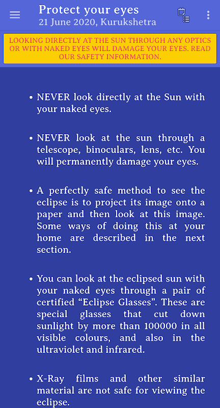 Aplikasi ini menunjukkan maklumat tentang gerhana matahari. Ia akan menunjukkan kepada anda keadaan gerhana untuk mana-mana lokasi yang anda pilih untuk Eclipse yang dipilih. Anda boleh memilih mana-mana gerhana matahari dari 2000BC hingga 3000AD. Laluan anggaran bayang-bayang matahari di bumi juga ditunjukkan.