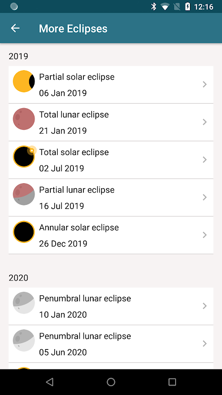 This astronomy app calculates upcoming and past eclipses of the Sun and Moon, anywhere in the world. Easily find local times for when a total solar eclipse is visible or use the map to see where you have to go to see the next total lunar eclipse.