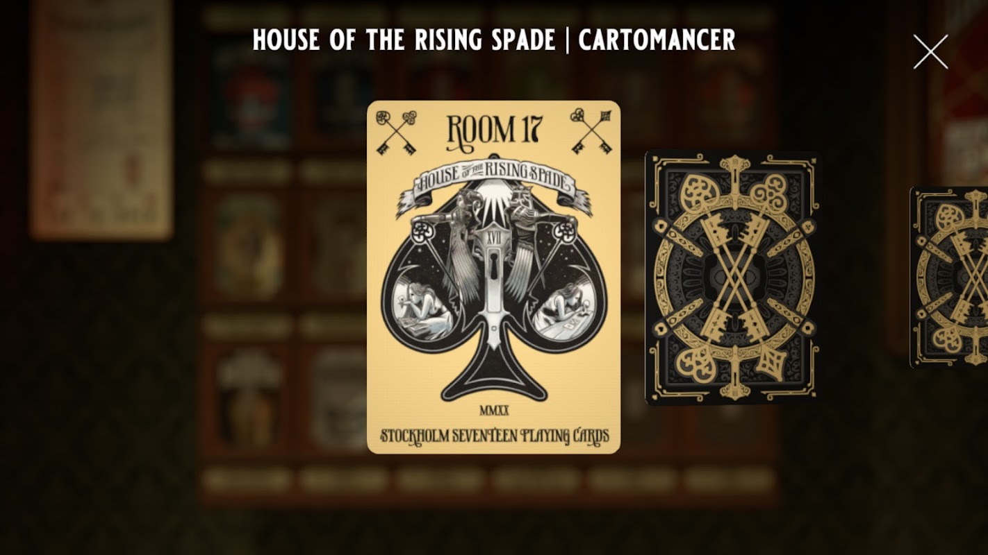 Anda akan menavigasi koleksi anda dan pratonton kad dek tersuai lain yang tersedia sebagai pembelian dalam apl. Semua dek ini direka oleh Stockholm17 Playing Cards, Sweden. Sebarang dek tersuai boleh digunakan untuk bermain permainan. Pastikan anda membaca sifat keterbacaan dalam permainan setiap dek sebelum pembelian, sesetengah daripadanya mungkin sukar dibaca pada peranti dengan skrin kecil.