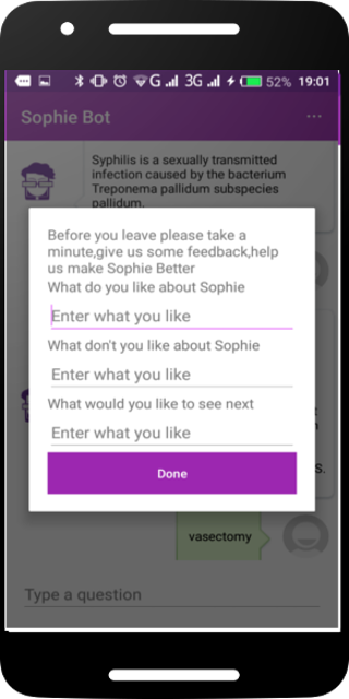 Sophie is a smart chat robot who knows about reproductive health. Ask her any questions about sexual and reproductive health. We have fed her with a lot of knowledge about sexual and reproductive health. She also talks back but you can shut her up if you so wish.