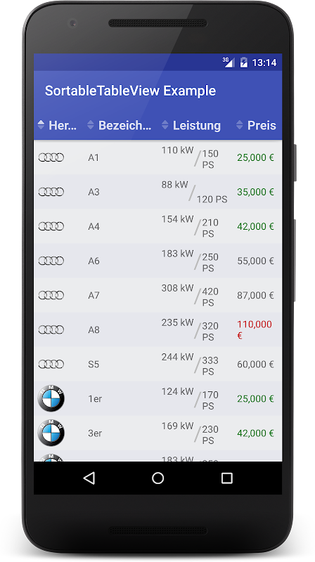 Ini contoh yang kecil menunjukkan cara menggunakan SortableTableView itu. Lihat perpustakaan SortableTableView pada GitHub. https://github.com/ISchwarz23/SortableTableView