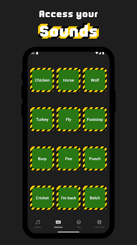Guna gerak isyarat untuk menukar antara kategori dan pilih antara bunyi yang ada. Kami telah mempermudahkan aplikasi untuk menjadikannya mudah diakses oleh semua orang, dengan antara muka yang jelas dan butang besar.