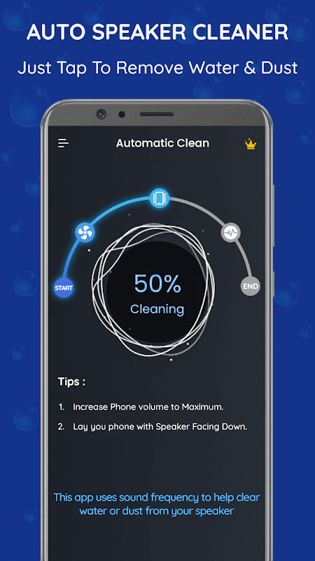 Apl ini menggunakan frekuensi bunyi untuk membantu mengeluarkan air atau habuk daripada peranti anda. Ia tidak menjamin penyingkiran atau pembaikan sepenuhnya. Jika telefon anda rosak teruk, sila hubungi juruteknik.