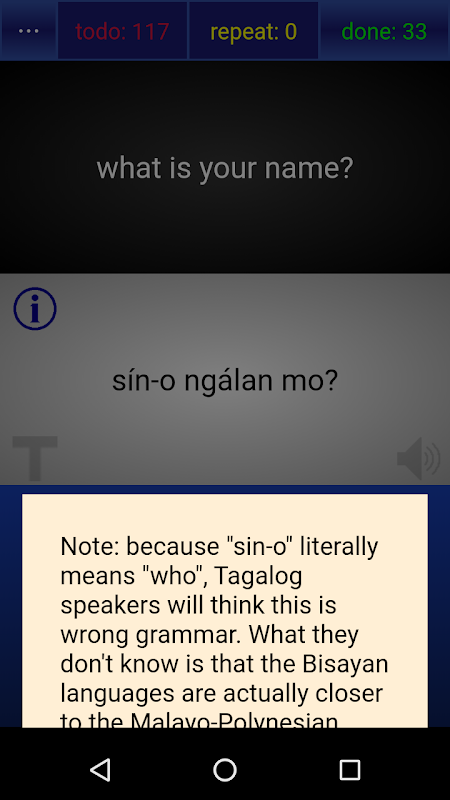 Aplikasi ini membolehkan pengguna mempelajari setiap ayat melalui percubaan dan kesilapan. Mereka ditunjukkan terjemahan bahasa Inggeris dan ditugaskan untuk membina frasa Ilonggo yang sesuai dengan kata demi kata. Sekiranya mereka melakukan kesalahan, frasa secara automatik dimasukkan ke dalam timbunan "ulangi", dan mereka akan diberi kesempatan lain beberapa saat kemudian untuk mencuba lagi sehingga mereka melakukannya dengan betul.