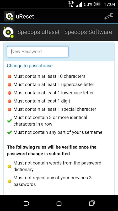 Sama ada syarikat anda mempunyai Specops uReset atau Specops Self-Service Password Reset penyelesaian di tempat, aplikasi mudah alih akan memaparkan penyelesaian yang tepat yang membolehkan anda untuk menetapkan semula kata laluan anda sendiri dalam masa yang singkat.