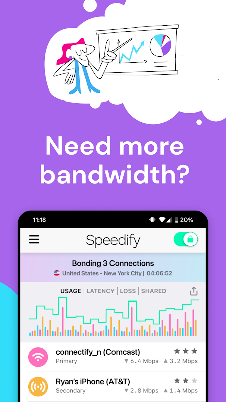 Teknologi ikatan saluran unik Speedify membolehkan anda menggabungkan semua sambungan yang tersedia bersama-sama untuk meningkatkan prestasi dan kebolehpercayaan.