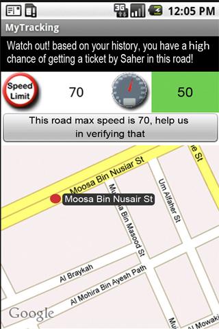 Drive carefully, and once speedy, "Speedy! Watch out" will notify you with the speed limit of the road you are in. It will tell you the chance of getting a speed ticket based on your driving history in the current road. Its database is user-generated, you can add, verify, and report speeds and Arabic names for the roads (they are originally in English only).