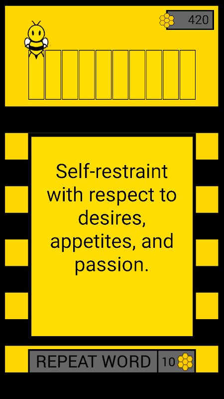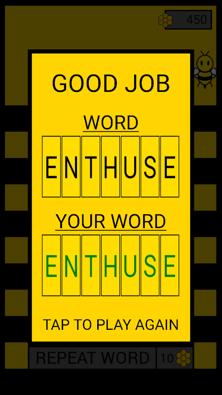 Join the spelling bee. Spell words with just your voice. Collect honey and use it to help you spell words. There are thousands of different words to learn. Vowels are not always recognized by your phone. If this happens, change the settings to play without vowels.