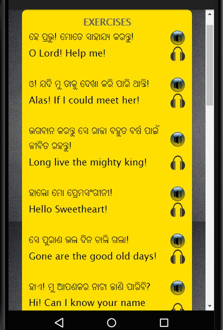 ***** This app is useful in giving you the knowledge of English Basics before you start learning Business English. After completing this tutorial, you will be able to figure out common mistakes In English. Often people jump start with Grammar and Parts of Speech, but it is suggested that you first learn with this Oriya to English Phrasebook. Learn to Speak English by Play & Learn method. You can Learn Languages free using the techniques specified in this learn english magazine. This app gives you a basic BPO Interview Briefing. Use this speaking english book free and make full use of this speaking english course app. Your next step could also be a group discussion app for interview or an app on English for competitive exams - it will completely your choice. Comprehending English verbs through English listening can also be your future course of action. Here you can also learn to some extend, English for BPO. Learn English by Listening and find here Interview Questions and Answers. You will also be able to Learn English Words or Learn English Vocabulary Daily. This can be your first step towards learning English for Bank Exam. Later, you can refer an Idioms and Phrases Dictionary and strengthen your English. If you are wondering as to how to speak english fluently in 30 days, this can be your perfect destination. We suggest that after you have completed perusing through your app content, you can memorize Synonyms and Antonyms or chisel your English for Banking & SSC preparation. Remember that this is a Odia to English Speaking app.