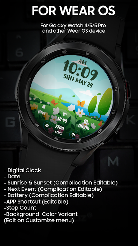 Muka jam digital dengan ilustrasi landskap musim bunga. Untuk jam tangan pintar Wear OS. Ciri: