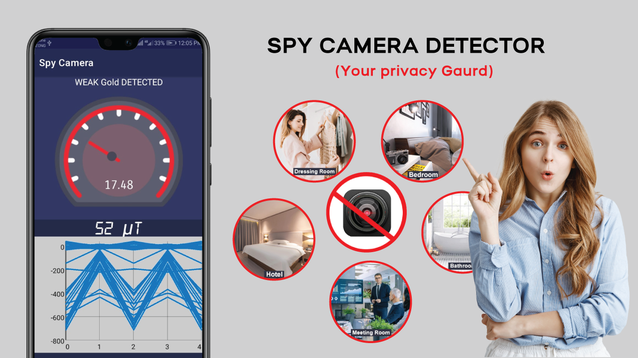 Hidden camera detector save your privacy from spy camera anywhere. You need such hidden microphone detector app hidden camera detector app if you are in hotel with your family. By using your smart phone and spy hidden camera locator and hidden camera finder and move your device near suspected area.
